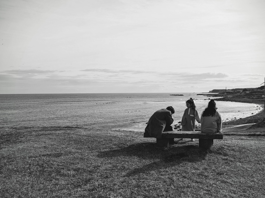 たとえば、広がる海を前に並んで座る三人。 波の音だけが響く静かな情景に、彼らの存在が加わることで、語られることのない会話や、それぞれの心に去来する想いが写真に宿ります。 それは、ただの風景だった一枚が、一瞬にして「誰かの時間の切り抜き」に変わるのです。