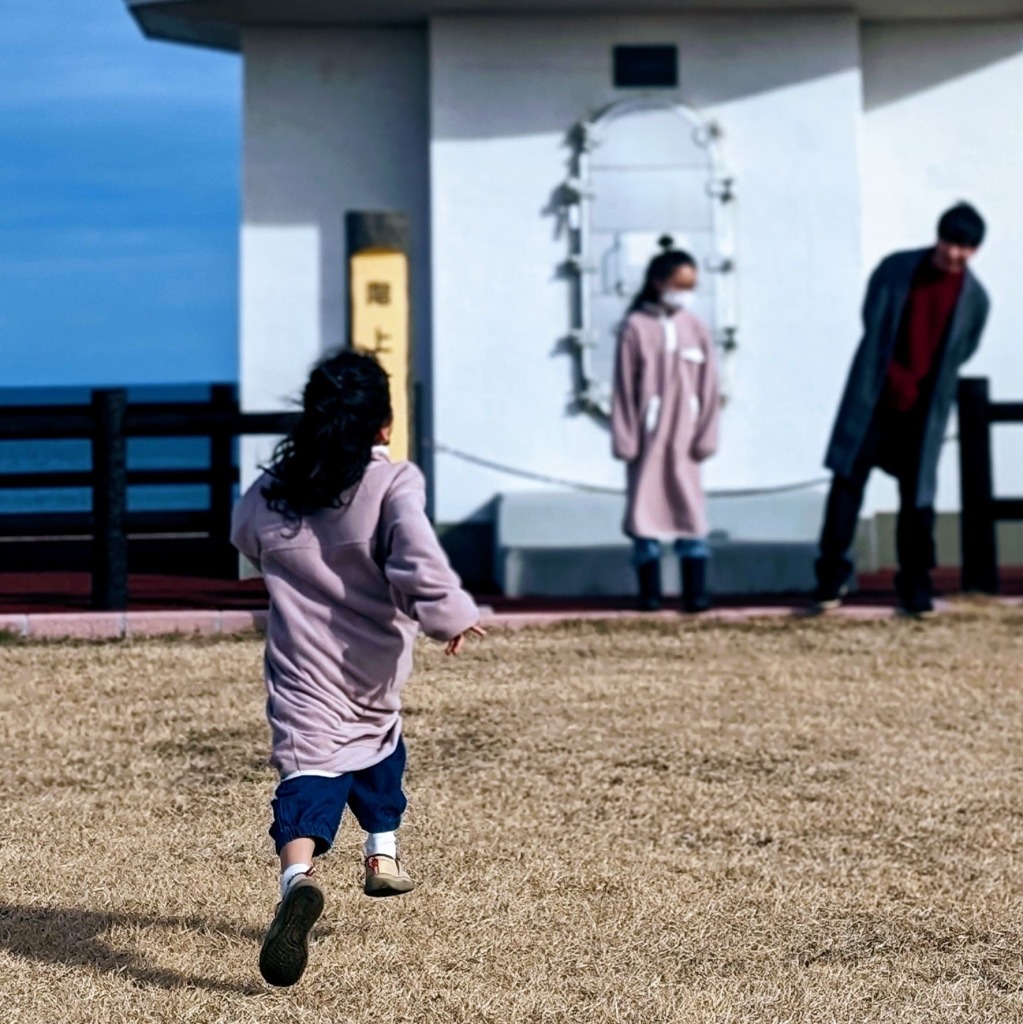 灯台の下で、元気いっぱいに駆けていく小さな背中。その先には、立ち止まる二人。この子にとって灯台は冒険の始まりなのか、それとも、誰かに向かっていく一途な気持ちの表れなのか。見守る二人の眼差しからも、様々な背景が想像できます。