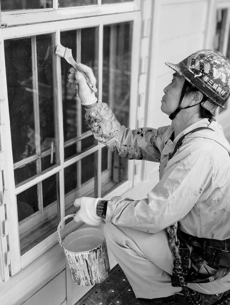 真剣な眼差しでペンキを塗る職人の姿。ただ「作業をしている」というだけでなく、そこには「何かを作り出す」「守り続ける」という、力強いメッセージが込められているように感じます。彼が何を塗り替え、何を未来へと繋ごうとしているのか。その物語は、見る人の心に深く問いかけます。