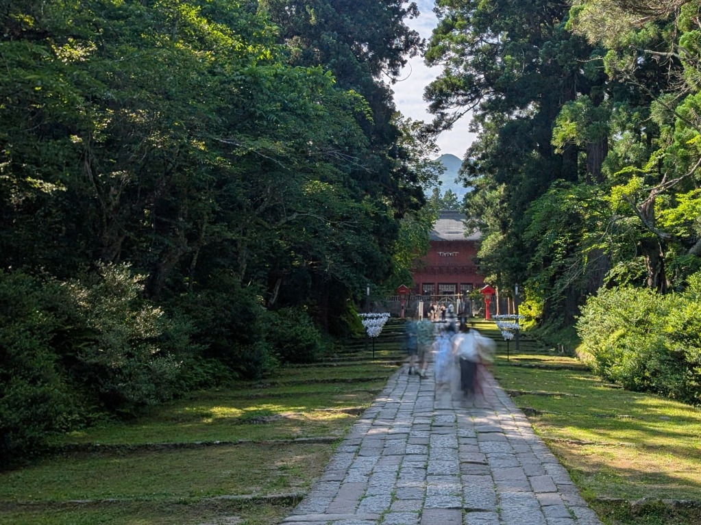 神社へと続く石畳の参道を、まるで時が止まったかのように静かに歩く人々。光の中に溶け込むようなその姿は、神聖な場所への期待感、あるいは過ぎ去った時間への郷愁すら感じさせます。