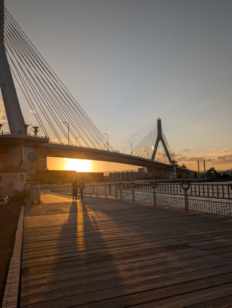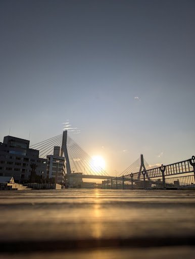 日が傾き始めると、空の色は刻一刻と表情を変えていく。 オレンジ、ピンク、そして深い青へ。その光を浴びて、ベイブリッジやアスパムのシルエットがくっきりと浮かび上がる。